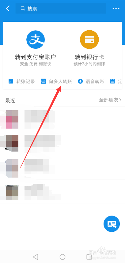 进入支付宝转账界面后,直接点击这里面的【标的目的多人转账】,如下图所示。