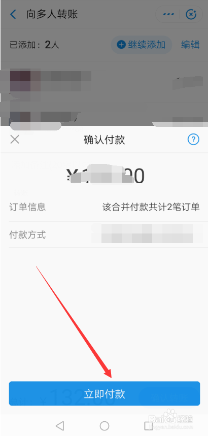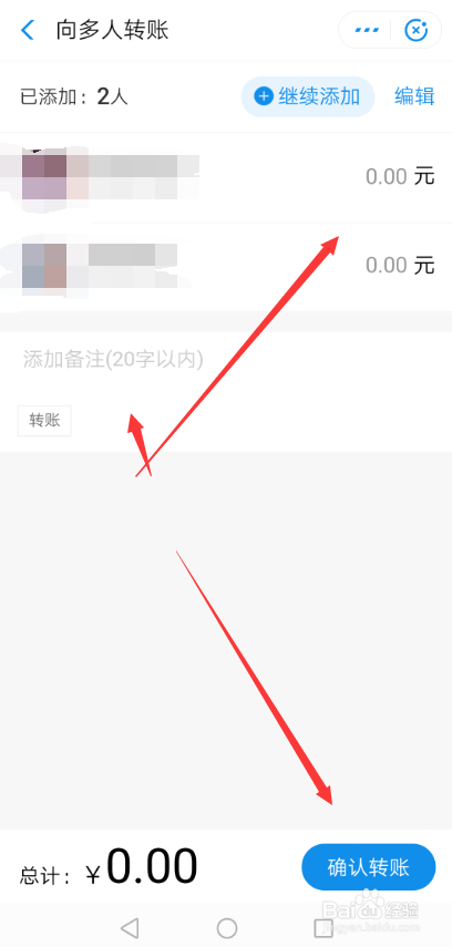 添加好标的目的多人转账的老友后,直接点击后面输入转账金额,然后点击下面的【确认转账】按钮,如下图所示。