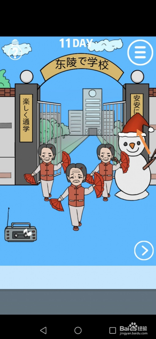 第11关先点击雪人头上的帽子,接着点击标的目的右箭头到右边去。在右边,点击地上的衣服和裤子。
