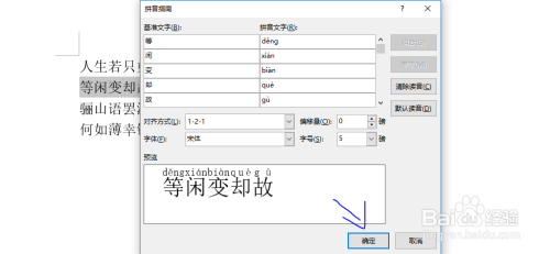 在拼音指南窗口设置好参数后,单击确定键,成果如图所示,第二行文字已经实现了显示拼音。