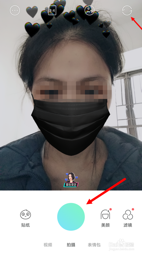 选择好贴纸后,翻转摄像头瞄准你需要拍摄的人物头像,长按下方的绿色圈圈起头拍摄。