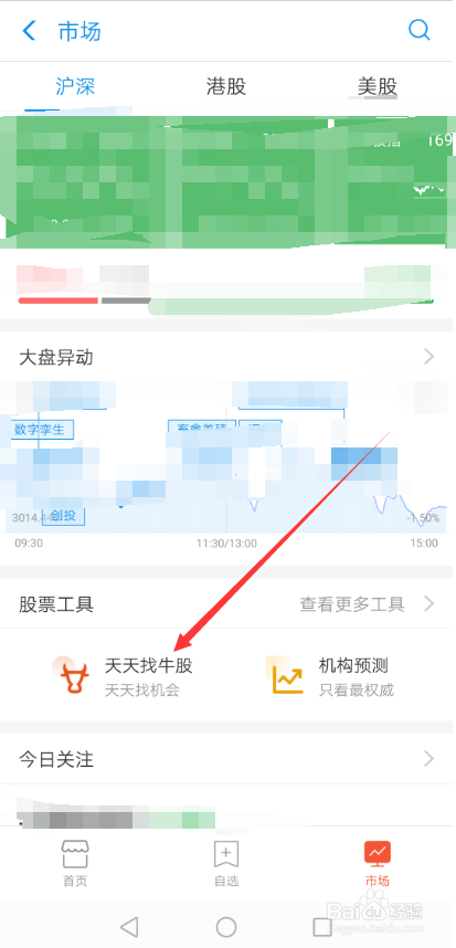 进入股票首界面后直接点击底部的【市场】选项卡,如下图所示。