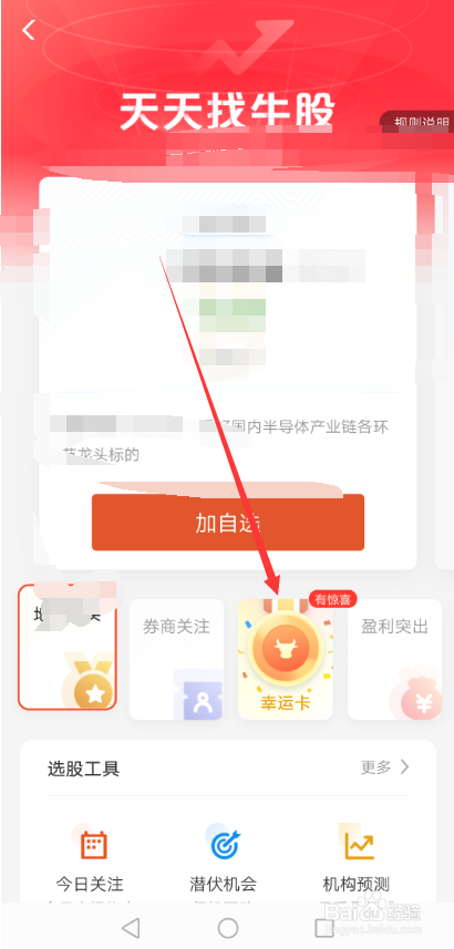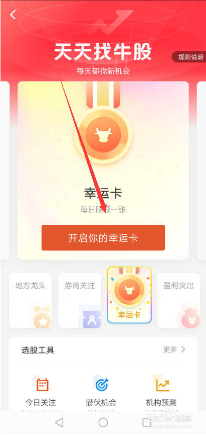 进入天天找牛股界面后,直接点击下面的【幸运卡】,如下图所示。
