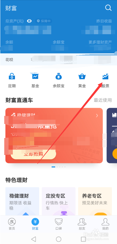 在支付宝的财富界面里直接点击右上角的【股票】,如下图所示。