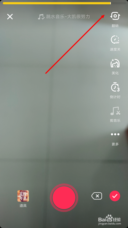 进入到拍摄镜头时,我们可以看到这个音乐是只撑持拍摄6秒的视频,我们需要点击【倒计时】调整好小视频。