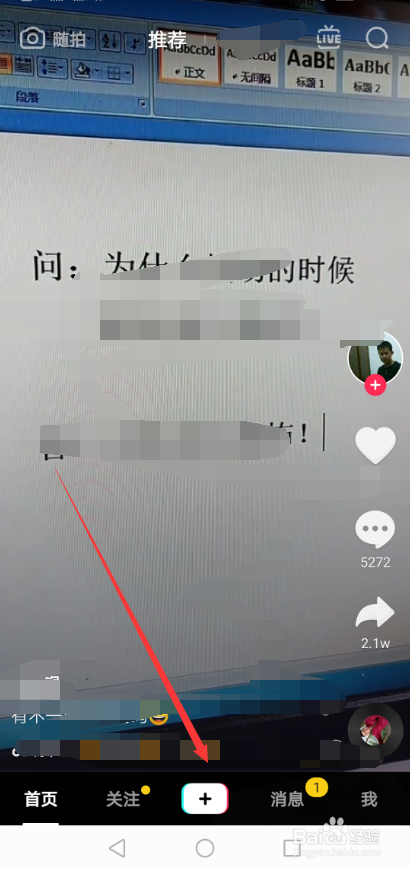打开抖音短视频APP后,直接点击底部的【+】,如下图所示。
