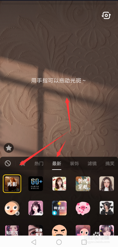 在弹出的道具对话框里的最新选项卡里找到【光影】特效,选中后,提醒用手指可以拖动光斑,如下图所示。