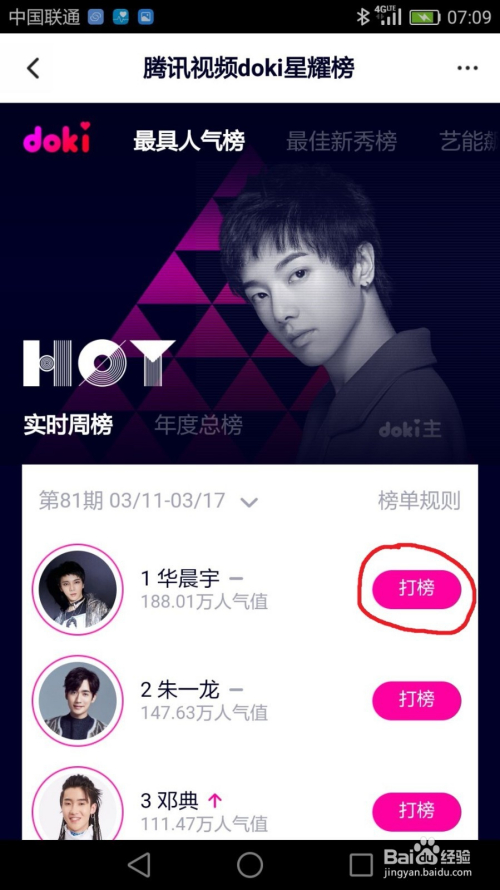 进入到腾讯视频doki星耀榜,最初在上方显示的是最具人气榜,可以选择查看其他榜单,好比最佳新秀榜、艺能飙升榜等;在榜单中选择你喜好的偶像,好比我们就为华晨宇打榜,选择点击右边的“打榜”,如图中红色标识表记标帜;