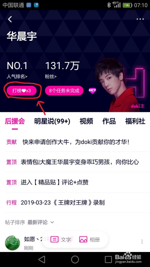 接着我们就插手到了华晨宇的doki团,可以浏览底下的一些互动内容,若是打榜的话,选择点击“打榜”,如图中红色标识表记标帜所示,可以看到我这有3个心跳,心跳可以经由过程签到、浏览内容等获得;