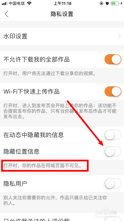 然后在 隐私设置 的页面,可以看到 埋没位置信息 的选项,用手指滑动打开后面的按钮。此按钮打开后,本身的作品在同城页面不成见,也就是说跟本身处于统一城市的人就看不到本身的作品了。