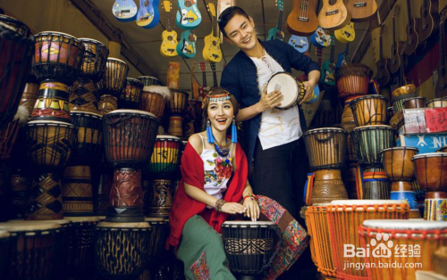 在逛乐器商铺时,也可以找到平易近族风的摄影美景,好比下图所示,操纵手鼓为布景陪衬出本家儿人公的喜悦表情,在表现平易近族风的同时,还拍出了幸福感。活泼在于抓拍人物的脸色。