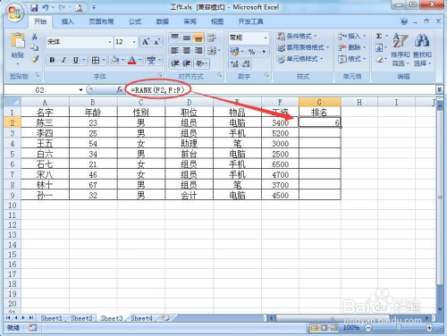 在要排序的单位格,输入"RANK()" 如图所示。