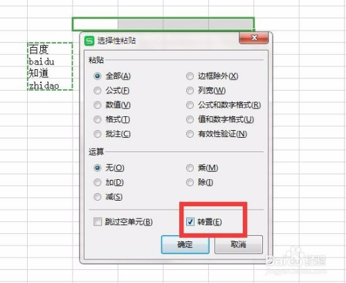 在弹出的“选择性粘贴”的对话框处,勾选下方的“转置”(如图)后确定。