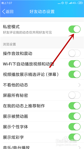 动态权限设置里找到【私密模式】,点击后方的开关。