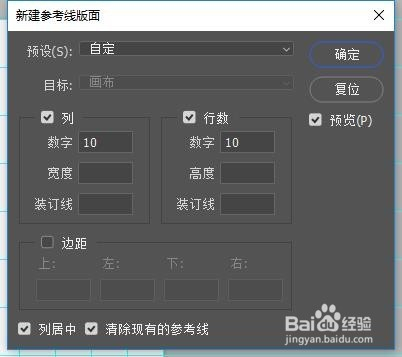 3、建立参考线面板为10行*10列,而且打消边距,用于辅助我们确定比例。