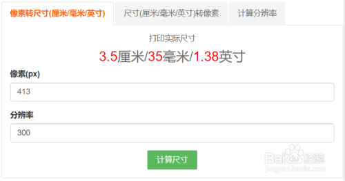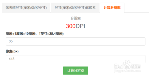 例如:一张照片高413px,分辩为300dpi,那么该照片高为:413/300*25.4=35mm。413/300计较出该照片高的长度(英寸),然后乘25.4把英寸转换为mm单元。