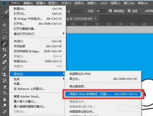选择“文件”-->“导出”-->“存储为web所用格局”菜单