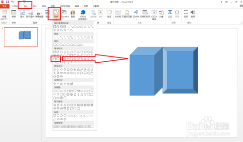 接着点击插入——外形——别离插入一个立方体和棱台,也可以插入其它肆意的外形,调整好位置,可以叠放在一路。