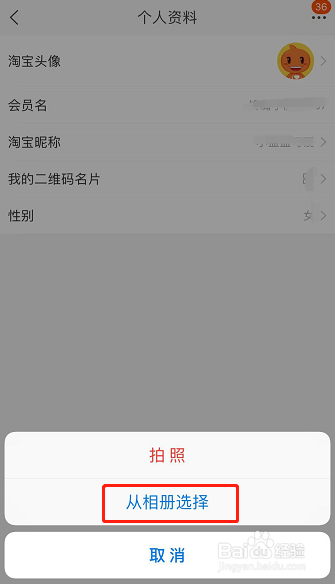 点击后屏幕下方弹出选择头像来历的对话框,小编以选择手机相册里边的照片当头像为例,点击【从相册选择】,然后页面跳转到手机相册!