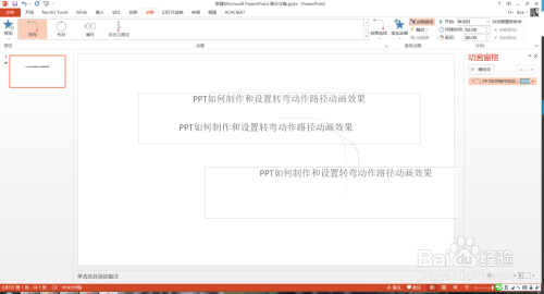 选中这些文字,点击动画菜单下的转弯动作路径动画结果,如下图所示。