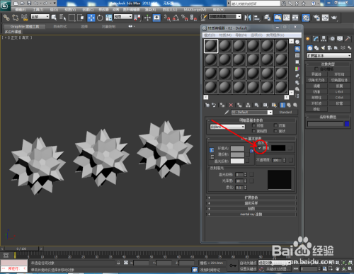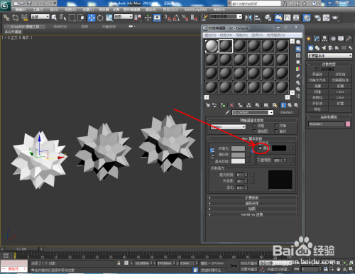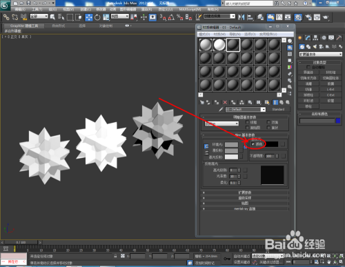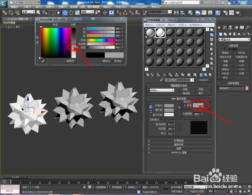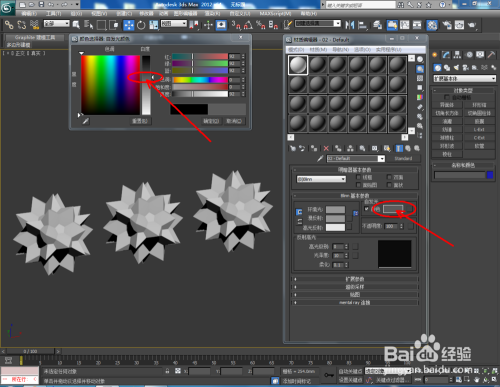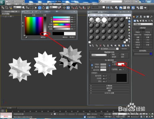 点击【材质编纂器】,弹出材质编纂器设置栏,选中一个新材质球,勾选自觉光【颜色】后,点击旁边的色板,按图示设置好自觉光的颜色参数。选中第三个星形,将材质指定给选定对象(如图所示);