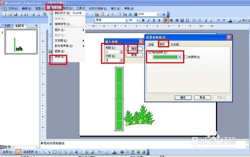 第五步,复制粘贴几个竹笋,然后插入——表格——设置1列6行——插入表格后,设置表格边框颜色为白色,表格填充绿色