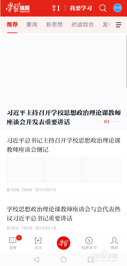 OK,学习强国新用户注册当作功后直接进入学习强国了,如下图所示。