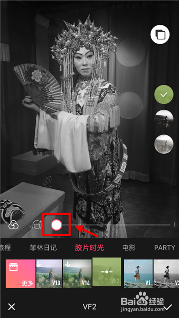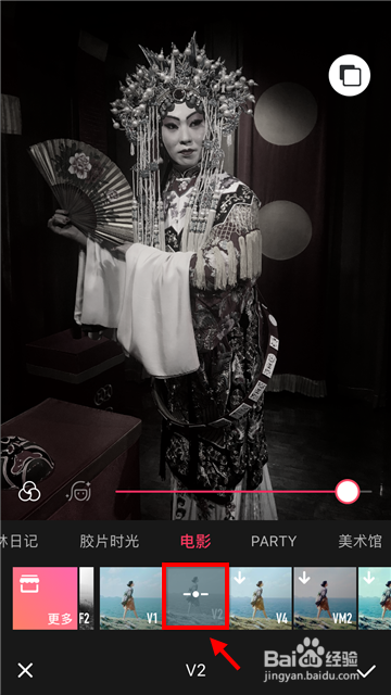第二种方式比力简单,直接在滤镜列表中点击V2(口角色),然后感觉暗淡将滤镜结果削减一些,最后点击“保留”。