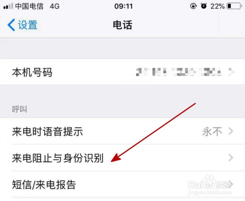 在德律风页面中会显示你的本机号码,这时我们点击“来电阻止与身份识别”打开,如下图