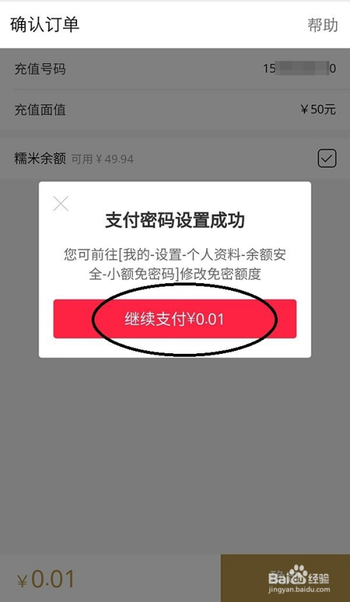 设置完密码后,因为糯米卡不克不及支付全数金额,还需要别的支付金额,点击【继续支付】