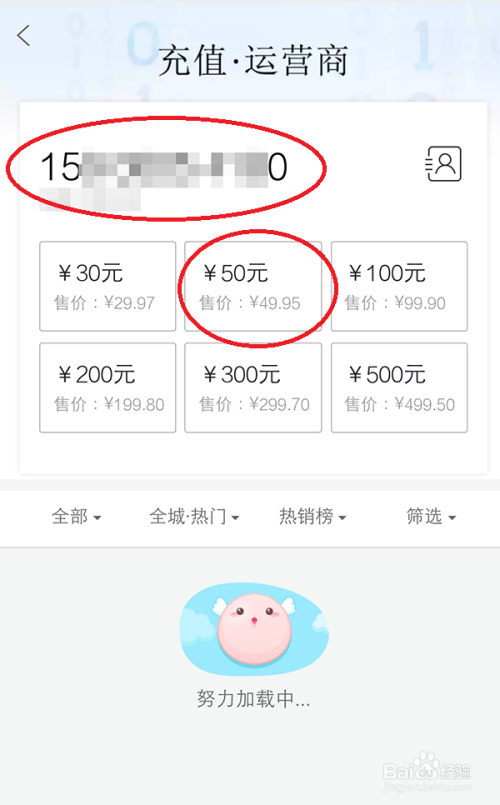输入手机号,再选择充值金额,如图所示。