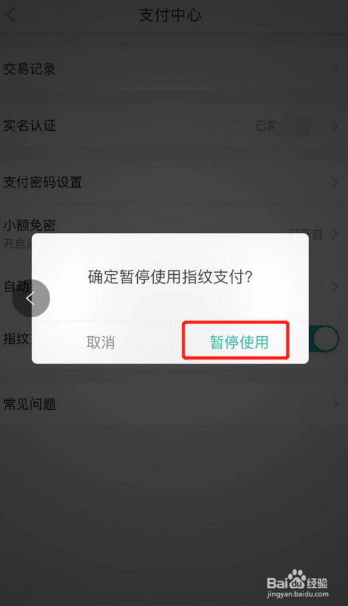 滑动滑块后,屏幕上会弹出如图所示对话框,点击【暂停利用】选项,指纹支付功能即可封闭!