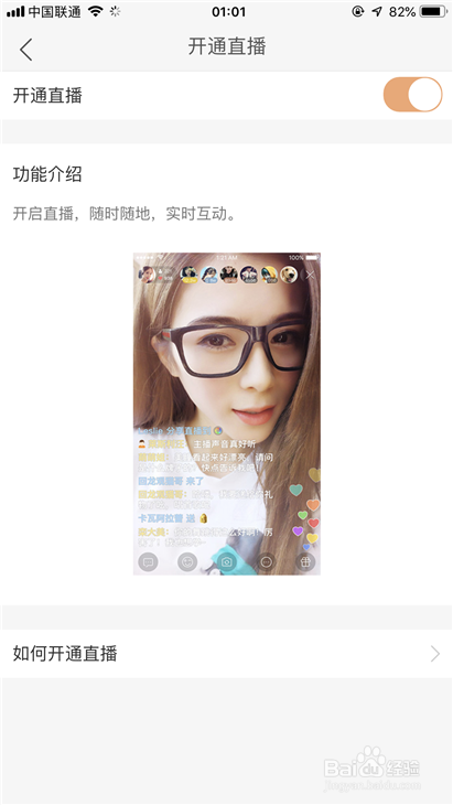 若是知足了上述前提,我们进入之后,点击一下开关将我们的直播功能打开,这样就可以进行直播了。