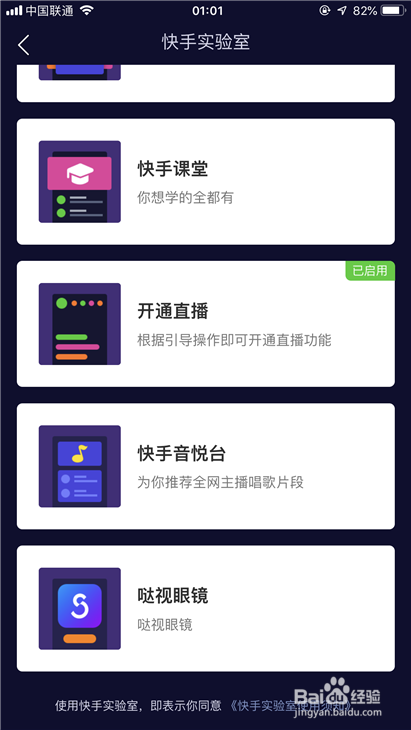 进入尝试室之后,我们往下面滑动屏幕,找到下面的直播功能,显示的是开通直播。