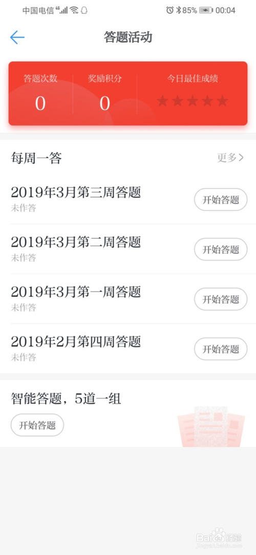 「智能答题」:答题满分得2积分,答题未获满分得1积分,5题一组,每道题下面都有谜底,不要求准确率,答了就有1积分,快答即可,一天最多6积分。