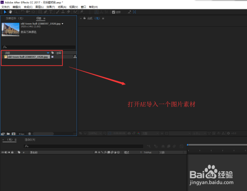 打开After Effects软件,建立一个新的空白项目,然后在项目中双击鼠标左键打开导入素材窗口,选中图片素材并导入。