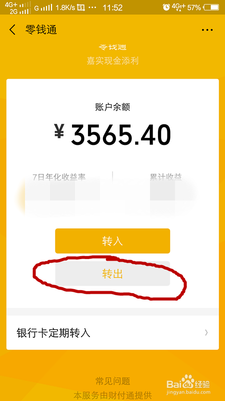 我们返回到零钱通,点击零钱通进入到零钱通的界面之后,我们可以看到下方有一个转出,我们点击转出,操作与零钱一样,不外纷歧样的事,零钱转入零钱通的不成以直接提现到银行卡,需要转入到零钱进行提现,如下图所示。
