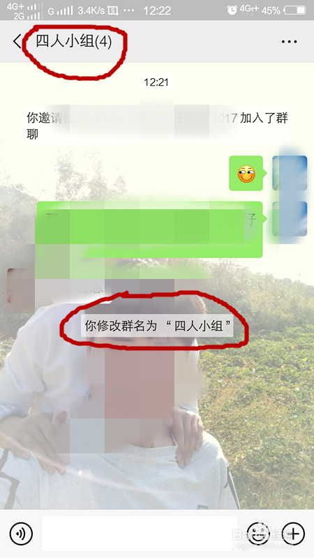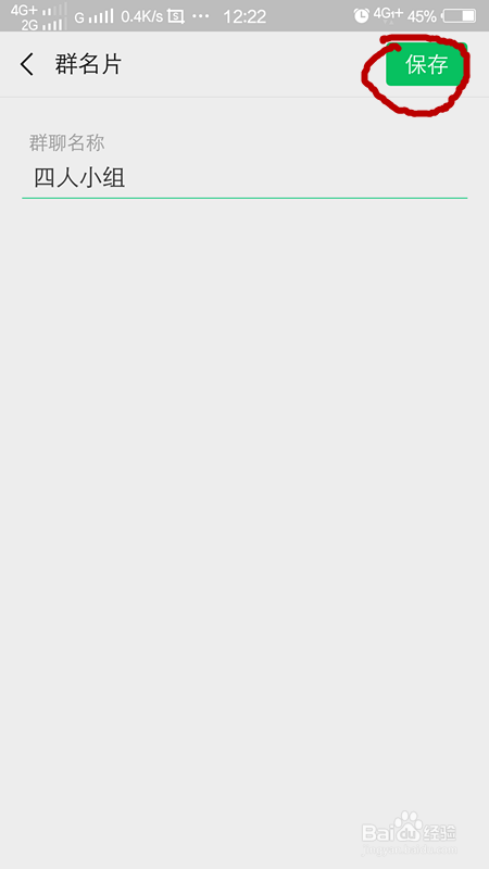 之后我们在上面输入你想起的群聊名字,点击上方确定,如下图所示,小编起的名字是四人小组。我们返回后,就看到群聊名字已经点窜当作功。