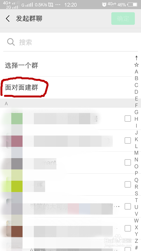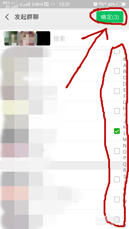 第二种方式是,我们点击倡议群聊后,点击伴侣后面的方框选中,我们选中要进入群聊的伴侣,之后我们点击右上侧确定,如下图所示。我们即可建群当作功。