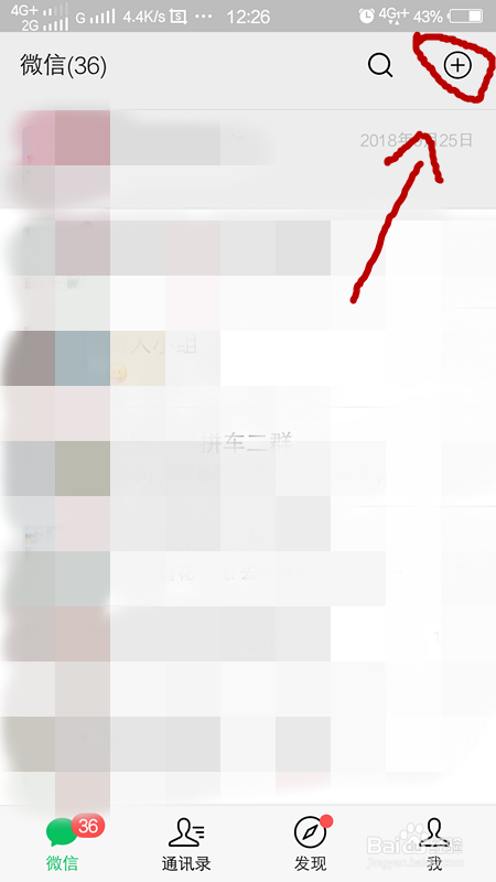我们首先打开我们的手机,点击微信进入微信的本家儿界面,点击右上角的加号,如下图所示。