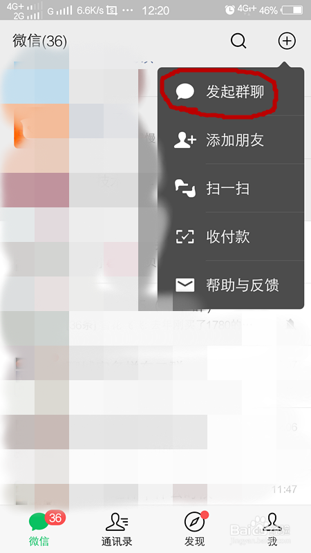 我们点击加号今后,会呈现几个选项,我们选择最上侧的那一个倡议群聊,如下图所示。