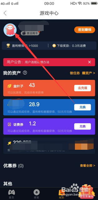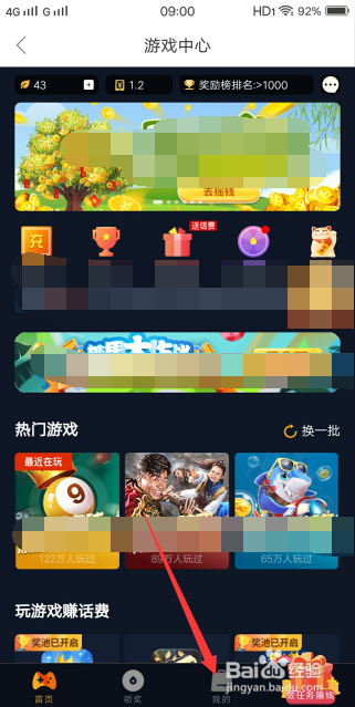 首先经由过程都雅视频进入到游戏中间,显示当前的金叶子和话费等信息,点击底部标签栏中的【我的】。