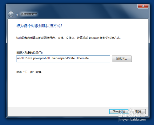 在对象位置一栏输入rundll32.exe powrprof.dll,SetSuspendState Hibernate,然后进入下一步