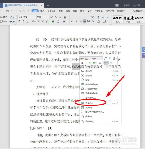 在右键菜单中选择“字体”单击
