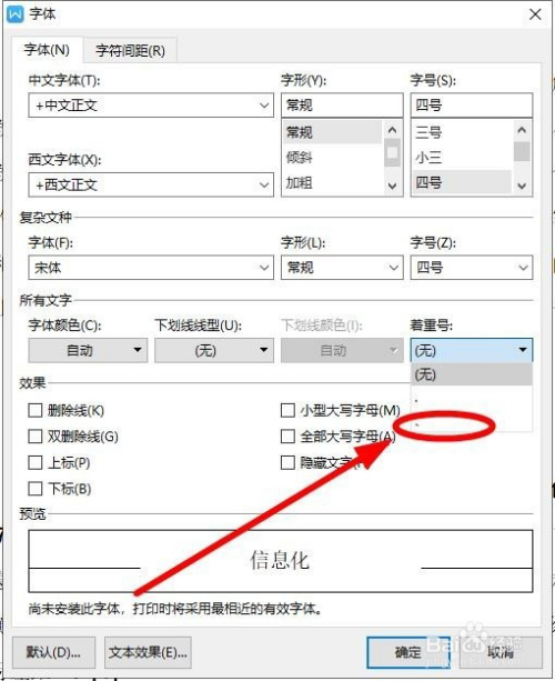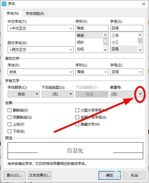 在弹出的“字体”对话框中,找到“着重号”下面的选择框后面的下拉箭头单击