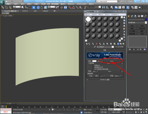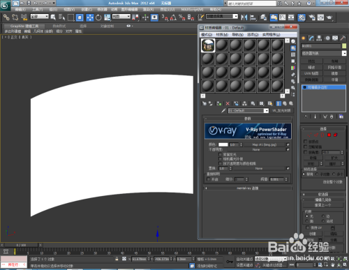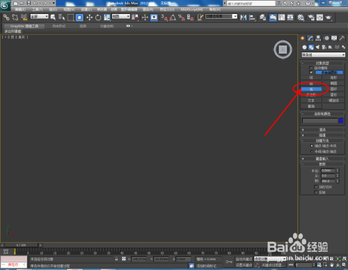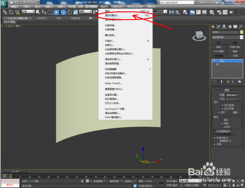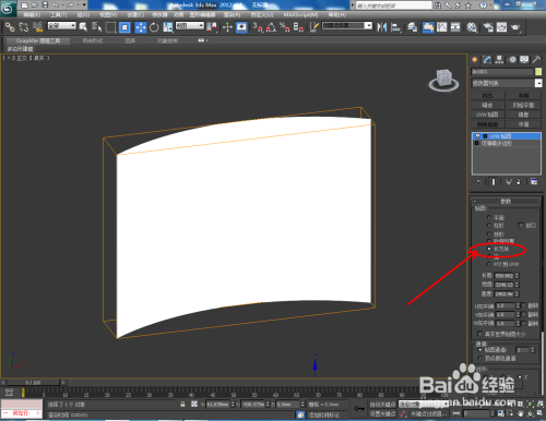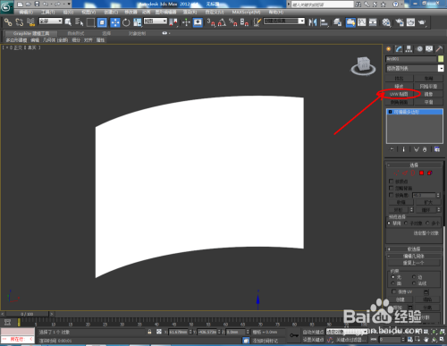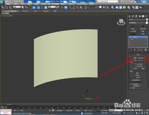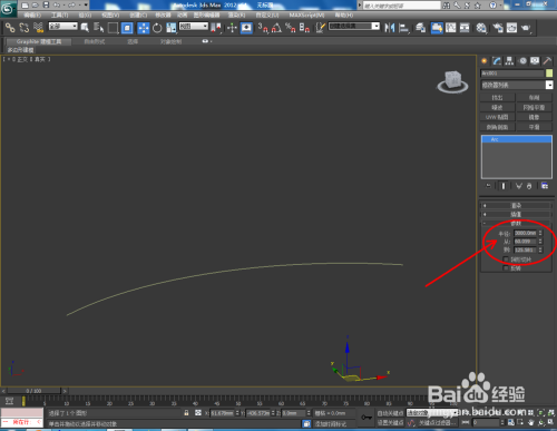 打开3Dmax2012软件,点击【建立】-【图形】-【弧】,在作图区域绘制一条弧,设置弧线半径为:3000mm。选中弧线,点击【点窜】-【挤出】,挤出数目设置为:2400(如图所示);