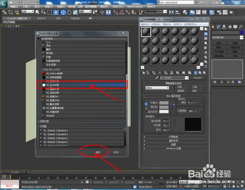 点击【材质编纂器】,弹出材质编纂器设置框,点击【standard】-【VR-发光材质】设置一个Vary发光材质球,并按图示设置好材质球的各个参数(如图所示);