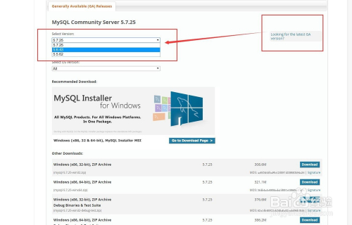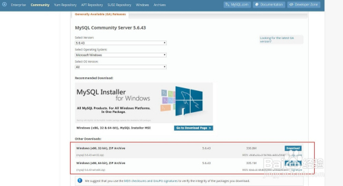 第四步,翻到该页面的最下面,如图所示,这里显示的版本是最新的,若是想要下载最新的,点击右下角的download下载即可。若是想要下载mysql5.6.43版本呢,点击右边红色框中的“Looking for previous GA versions?”意思是查找其它版本。