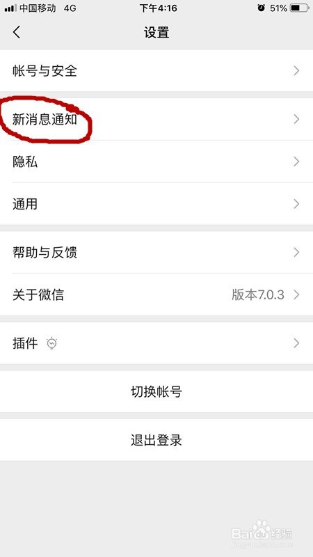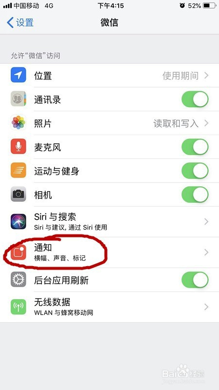 我们从设置界面找到微信进入后,看到有几个选项,我们点击选项中的通知,进入通知设置。