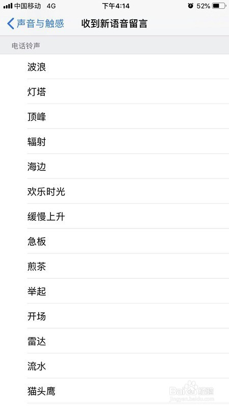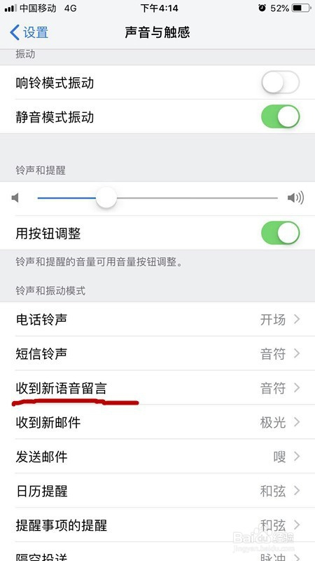 之后,我们返回到设置界面,找到声音与触感,点击进入。在声音与触感里面找到新语音留言,然后点击进入,如下图所示。